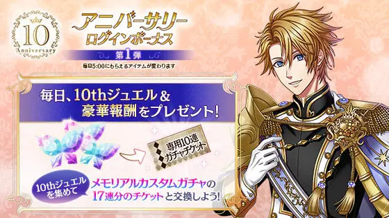 「10thジュエル」を集めると、後日登場予定の『メモリアルカスタムガチャ』で使えるメモリアル10連チケット等、豪華報酬と交換できます!